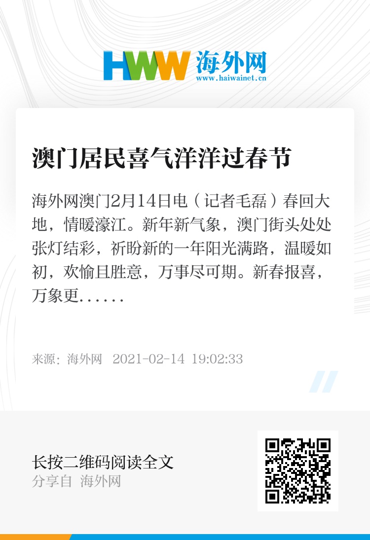 海外网澳门2月14日电(记者毛磊)春回大地,情暖濠江。新年新气象,澳门街头处处张灯结彩,祈盼新的一年阳光满路,温暖如初,欢愉且胜意,万事尽可期。