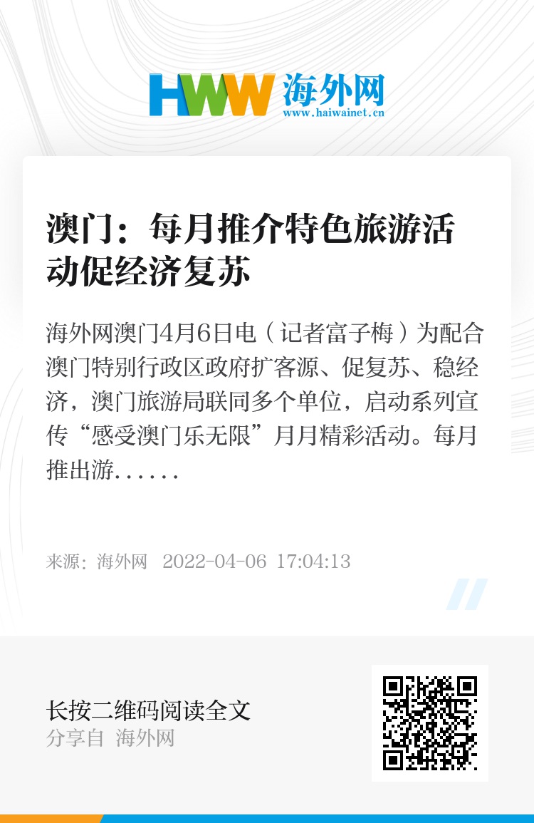 海外网澳门4月6日电(记者富子梅)为配合澳门特别行政区政府扩客源、促复苏、稳经济,澳门旅游局联同多个单位,启动系列宣传“感受澳门乐无限”月月精彩活动。每月推出游澳门特色主题,积极宣传当月盛事活动,吸引旅客来澳门旅游,推动旅游经济复苏。