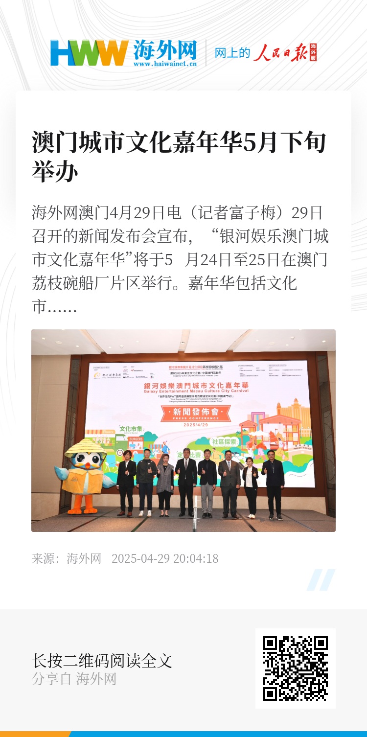 海外网澳门4月29日电(记者富子梅)29日召开的新闻发布会宣布,“银河娱乐澳门城市文化嘉年华”将于5 月24日至25日在澳门荔枝碗船厂片区举行。嘉年华包括文化市集、街区探索及定向比赛三项内容,引导参与者深入澳门路环市区,以“文化+社区+体育”的多元角度,发掘澳门深厚的历史文化底蕴及独特的街区魅力,并联动本地中小企业定位“社区商圈”,盘活社区经济。