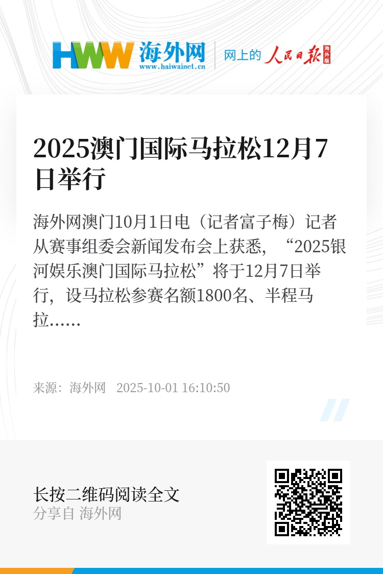 海外网澳门10月1日电(记者富子梅)记者从赛事组委会新闻发布会上获悉,“2025银河娱乐澳门国际马拉松”将于12月7日举行,设马拉松参赛名额1800名、半程马拉松4800名、迷你马拉松5400名。10月11日及12日开始接受报名。