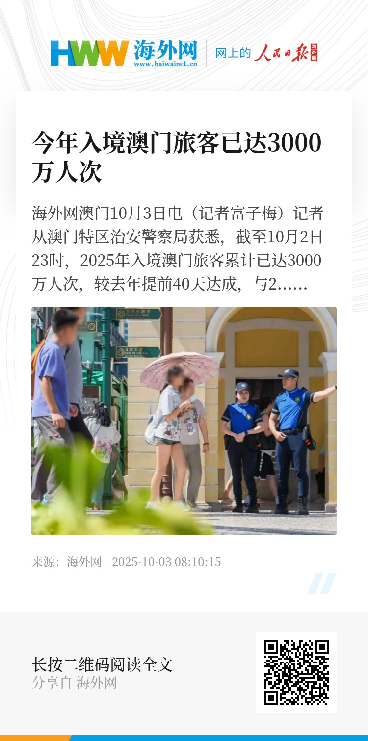 海外网澳门10月3日电(记者富子梅)记者从澳门特区治安警察局获悉,截至10月2日23时,2025年入境澳门旅客累计已达3000万人次,较去年提前40天达成,与2019年同期相若。其中,内地旅客占72.8%,香港、台湾地区和外籍旅客分别占18.4%、2.4%和6.4%。