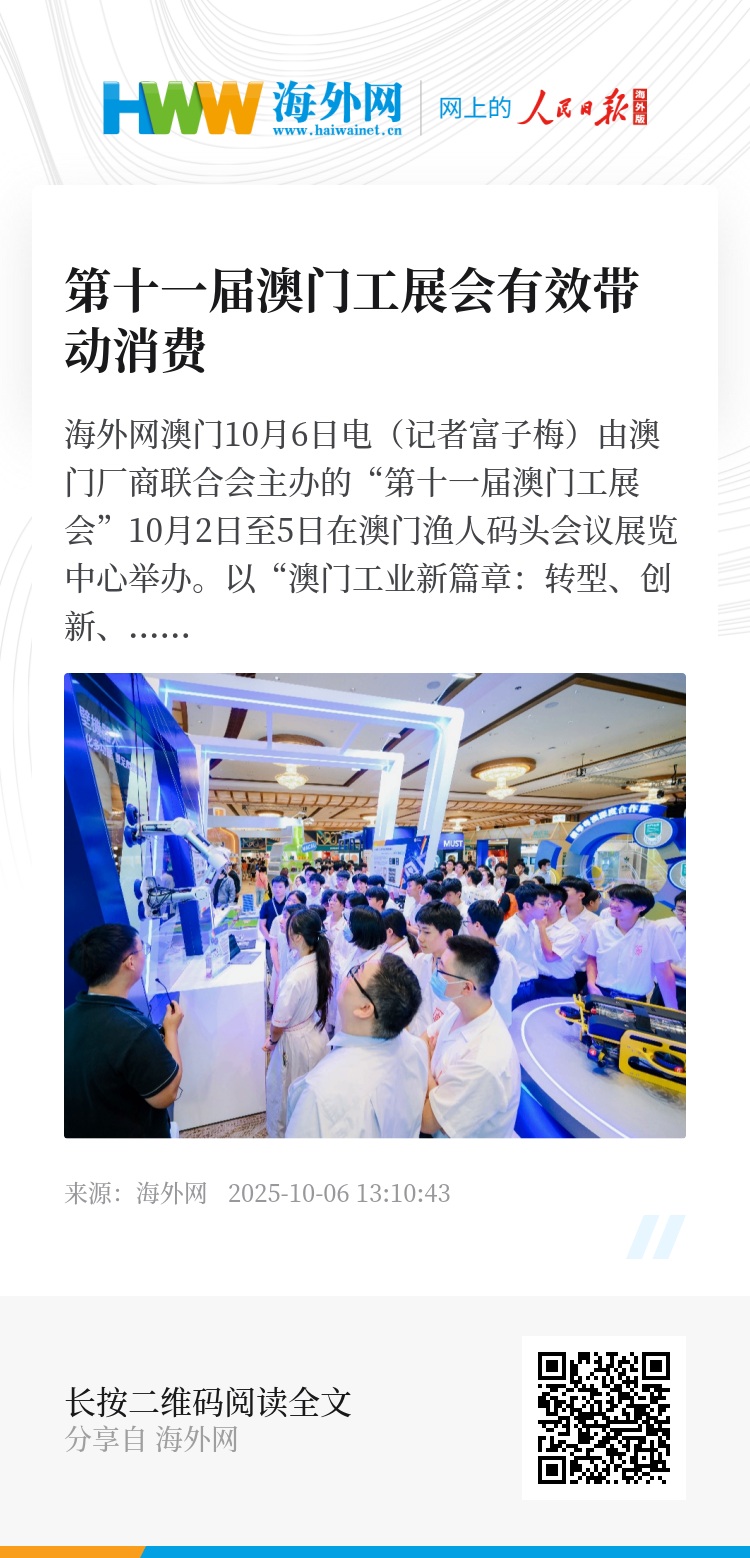 海外网澳门10月6日电(记者富子梅)由澳门厂商联合会主办的“第十一届澳门工展会”10月2日至5日在澳门渔人码头会议展览中心举办。以“澳门工业新篇章:转型、创新、融入世界”为主题,集中展示澳门高新技术、中医药大健康等重点领域的工业创新成果,搭建区域交流合作平台。本届工展会适逢内地国庆假期,客流畅旺,有效带动澳门本地产品销售,成效符合预期。