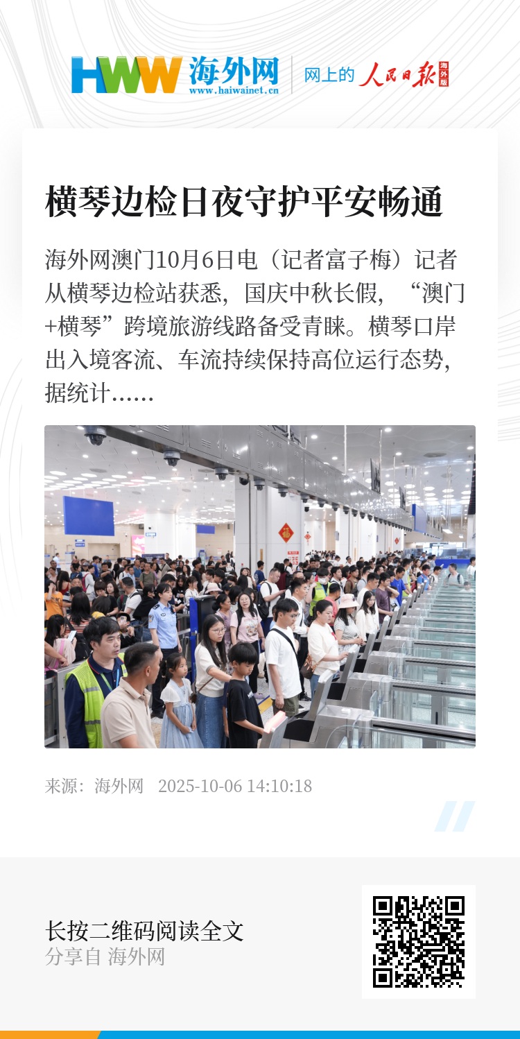 海外网澳门10月6日电(记者富子梅)记者从横琴边检站获悉,国庆中秋长假,“澳门+横琴”跨境旅游线路备受青睐。横琴口岸出入境客流、车流持续保持高位运行态势,据统计,10月1日至4日,横琴边检站共验放出入境旅客逾45.2万人次、车辆逾4.2万辆次,同比分别增长22.5%、44.8%,通关秩序整体平稳顺畅。