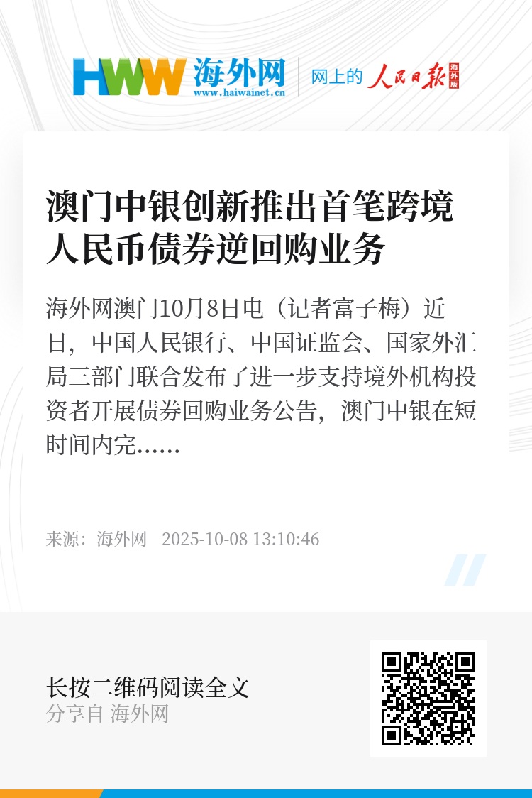 海外网澳门10月8日电(记者富子梅)近日,中国人民银行、中国证监会、国家外汇局三部门联合发布了进一步支持境外机构投资者开展债券回购业务公告,澳门中银在短时间内完成了多项准备工作,率先落地全球市场唯一债券通“北向通”跨境人民币债券逆回购业务。