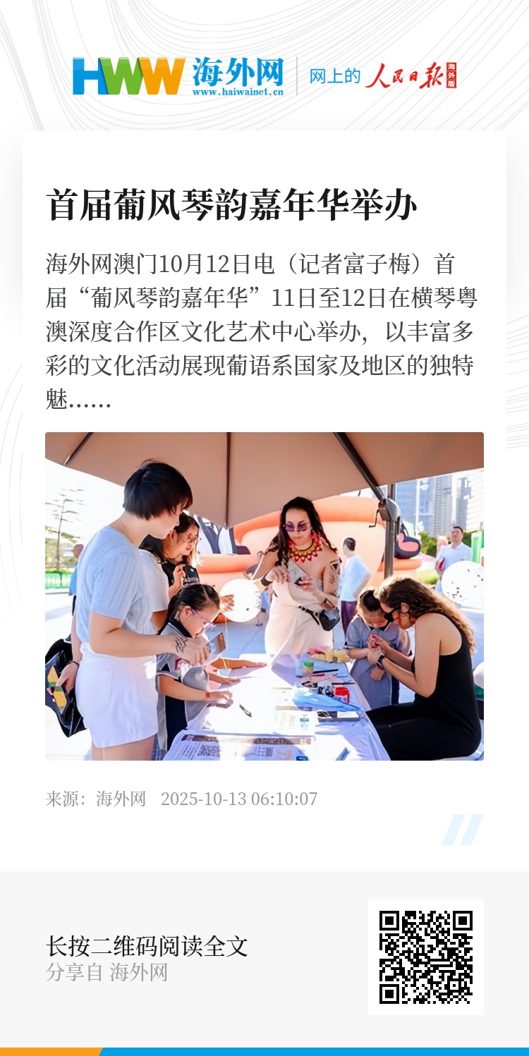 海外网澳门10月12日电(记者富子梅)首届“葡风琴韵嘉年华”11日至12日在横琴粤澳深度合作区文化艺术中心举办,以丰富多彩的文化活动展现葡语系国家及地区的独特魅力,为琴澳居民和游客带来一场具有异域风情的沉浸式文化体验,也为推动中葡文化交流搭建了新平台。