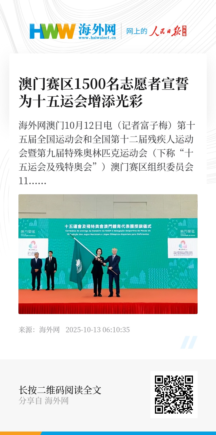 海外网澳门10月12日电(记者富子梅)第十五届全国运动会和全国第十二届残疾人运动会暨第九届特殊奥林匹克运动会(下称“十五运会及残特奥会”)澳门赛区组织委员会11日举行十五运会及残特奥会澳门体育代表团授旗仪式暨澳门赛区志愿者誓师大会,澳门特区行政长官岑浩辉向澳门体育代表团授旗,并见证志愿者庄严宣誓。