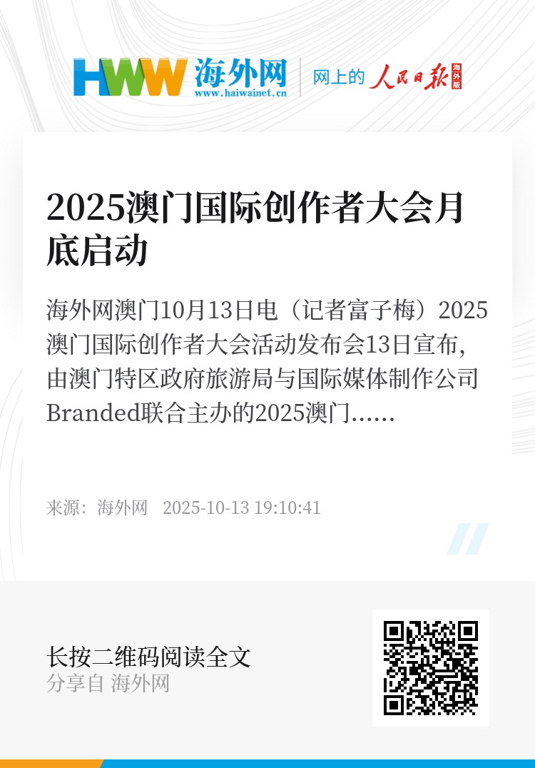 海外网澳门10月13日电(记者富子梅)2025澳门国际创作者大会活动发布会13日宣布,由澳门特区政府旅游局与国际媒体制作公司Branded联合主办的2025澳门国际创作者大会将于10月24日至28日在澳门举行。