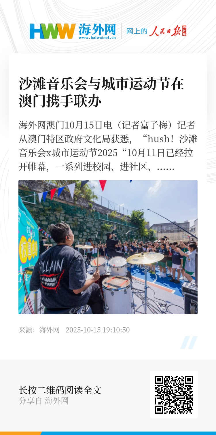 海外网澳门10月15日电(记者富子梅)记者从澳门特区政府文化局获悉,“hush!沙滩音乐会x城市运动节2025“10月11日已经拉开帷幕,一系列进校园、进社区、进景点的精彩活动一直持续到18日19日的主活动举办,集结歌手、乐队与各种强度类型的运动课程,让参与者在音乐的律动与运动的酣畅中,收获健康愉悦。