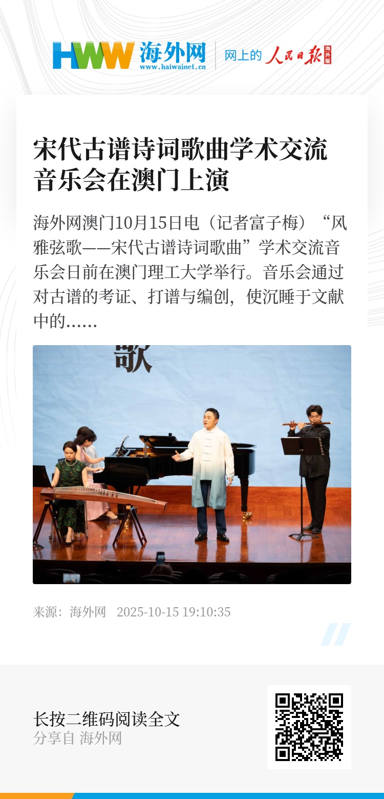 海外网澳门10月15日电(记者富子梅)“风雅弦歌——宋代古谱诗词歌曲”学术交流音乐会日前在澳门理工大学举行。音乐会通过对古谱的考证、打谱与编创,使沉睡于文献中的宋词音乐重新焕发生机,活态传承,实现研究、教学、创作、表演、传播与文化交流有机结合,展现中华传统音乐的深厚底蕴与独特魅力。