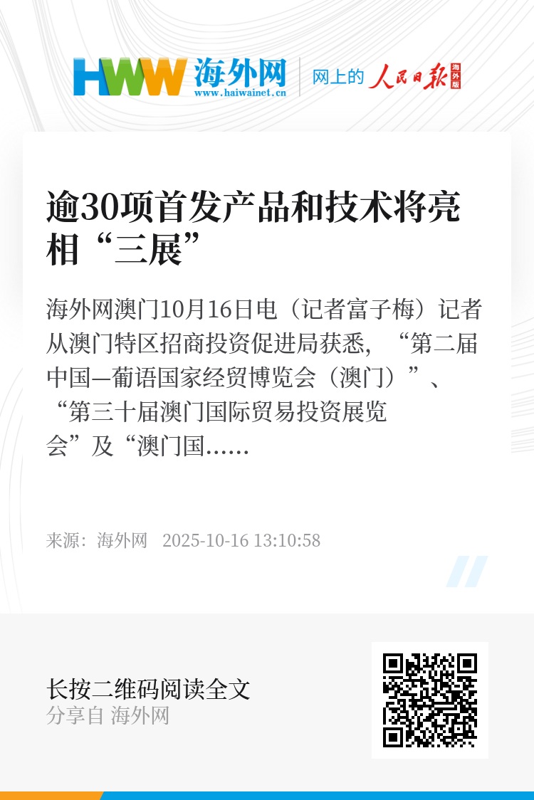 海外网澳门10月16日电(记者富子梅)记者从澳门特区招商投资促进局获悉,“第二届中国—葡语国家经贸博览会(澳门)”、“第三十届澳门国际贸易投资展览会”及“澳门国际品牌连锁加盟展2025”(下称“三展”)将于10月22日至25日在澳门同场同期举行。“三展”首日将举办“‘首发@澳门’项目发布会”,汇聚逾30项首发产品和技术,并引入电子智能系统和服务,助力澳门打造“智慧会展”新名片。