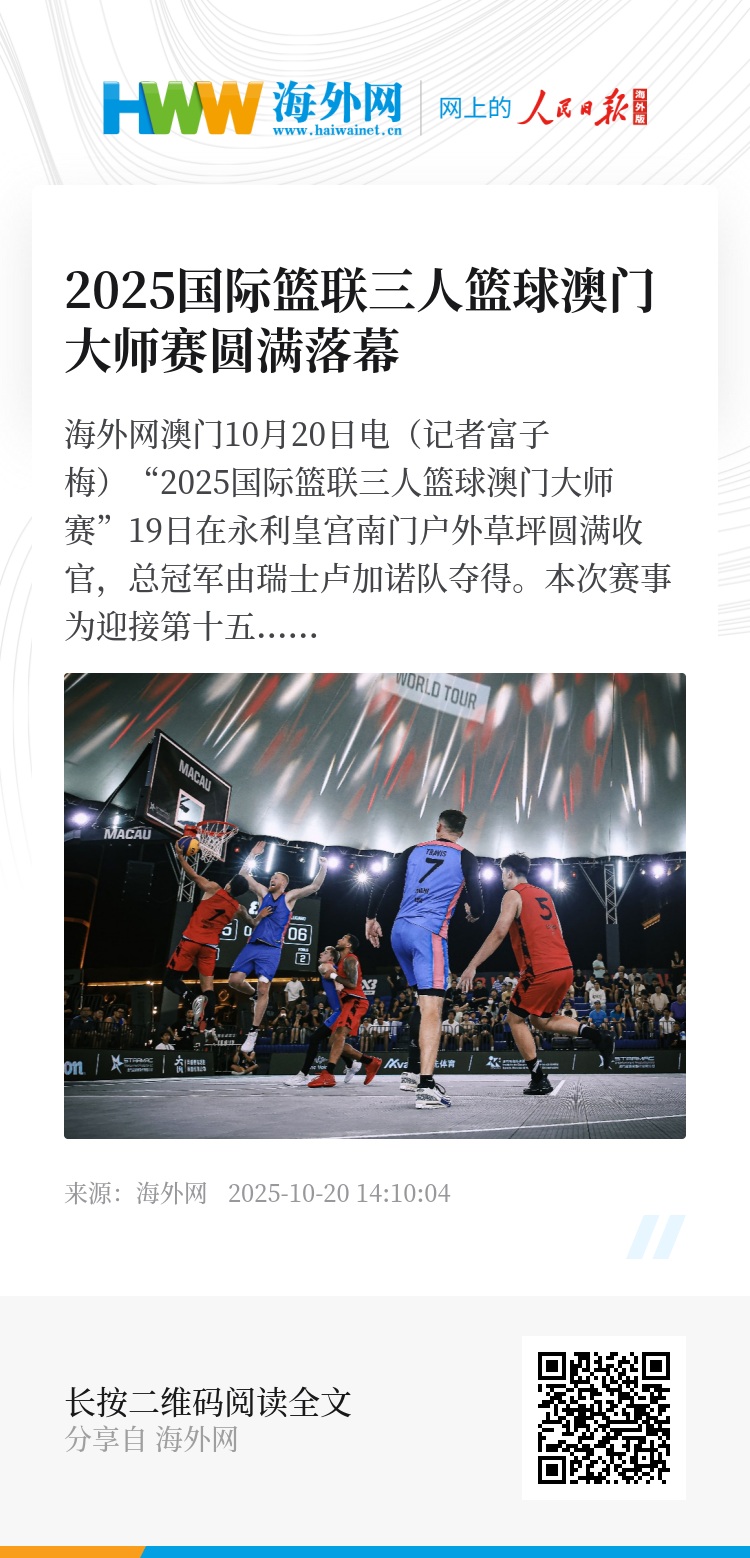 海外网澳门10月20日电(记者富子梅)“2025国际篮联三人篮球澳门大师赛”19日在永利皇宫南门户外草坪圆满收官,总冠军由瑞士卢加诺队夺得。本次赛事为迎接第十五届全国运动会三人篮球项目预热,进一步营造体育盛事的热烈氛围,让澳门居民及旅客感受澳门独特的体育魅力,推动澳门体育事业长远发展。