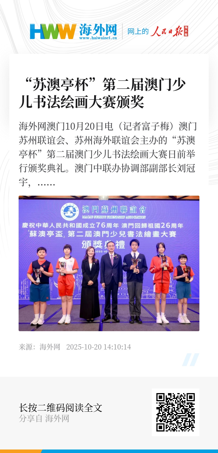 海外网澳门10月20日电(记者富子梅)澳门苏州联谊会、苏州海外联谊会主办的“苏澳亭杯”第二届澳门少儿书法绘画大赛日前举行颁奖典礼。澳门中联办协调部副部长刘冠宇,苏州市委常委、统战部部长王飏,澳门苏浙沪同乡会会长贺定一,澳门书法文化发展协会会长马腾,以及澳门苏州联谊会会长徐咏佩出席颁奖礼。