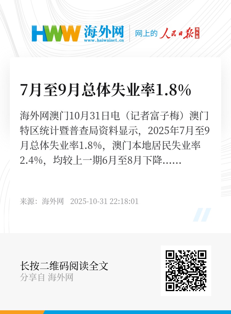海外网澳门10月31日电(记者富子梅)澳门特区统计暨普查局资料显示,2025年7月至9月总体失业率1.8%,澳门本地居民失业率2.4%,均较上一期6月至8月下降0.2个百分点。