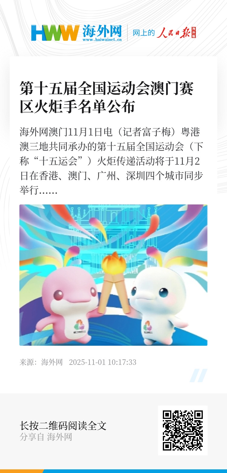 海外网澳门11月1日电(记者富子梅)粤港澳三地共同承办的第十五届全国运动会(下称“十五运会”)火炬传递活动将于11月2日在香港、澳门、广州、深圳四个城市同步举行。澳门赛区筹备办办公室10月31日公布50位火炬手名单,包括体育界代表、赞助商代表、青年代表和社会知名人士等,体现社会各界携手参与的重要意义。