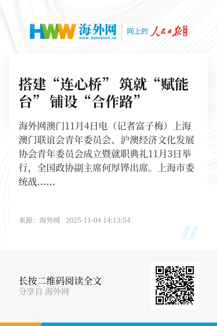 据悉,早在 2012 年,何厚铧秉持“让澳门青年成长与国家发展同行”的初心,推动成立“澳门青年人才学习实践计划”。十多年来,该计划帮助许多澳门青年了解国家发展,奠定了沪澳青年交流的基石。从“沪港澳青年经济发展论坛”到“港澳青年看祖国”交流团走进上海,越来越多澳门青年感受到内地发展活力,同时,也有更多上海青年了解到澳门“一国两制”的成功实践。
