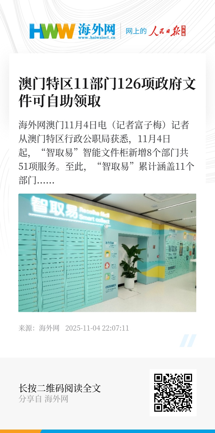海外网澳门11月4日电(记者富子梅)记者从澳门特区行政公职局获悉,11月4日起,“智取易”智能文件柜新增8个部门共51项服务。至此,“智取易”累计涵盖11个部门126项服务,市民可24小时自助领取证明书及准照等政府文件。