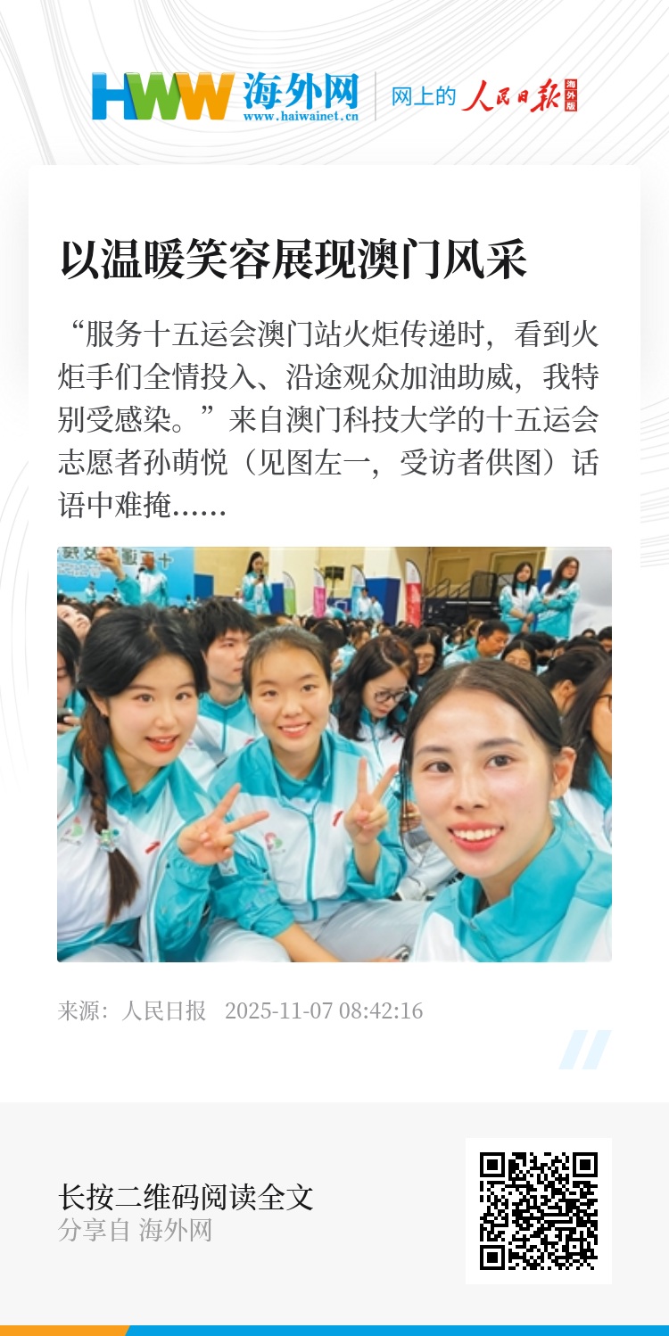 “我的同学在全运会深圳赛区做志愿者,我们在不同的地方为同一个赛事服务,这种感觉很奇妙。”孙萌悦说,本次全运会首次由粤港澳三地合办,她很荣幸参与其中,真切感受到澳门建设湾区、融入国家发展大局的脉动,“全运会将为澳门带来新气象、为大湾区带来新活力,期待我与大湾区共成长。”(本报记者 富子梅)