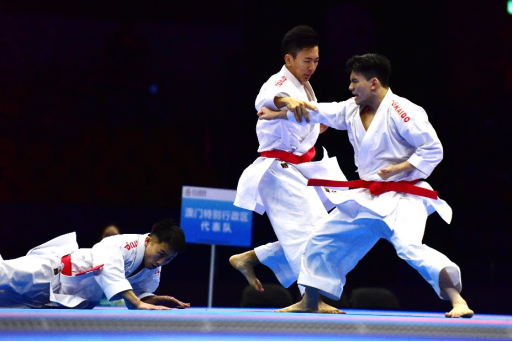 空手道比赛在澳门综艺馆举行,22个代表队的212名选手参加角逐,共产生8枚金牌,比赛将于11月8日鸣金收官。