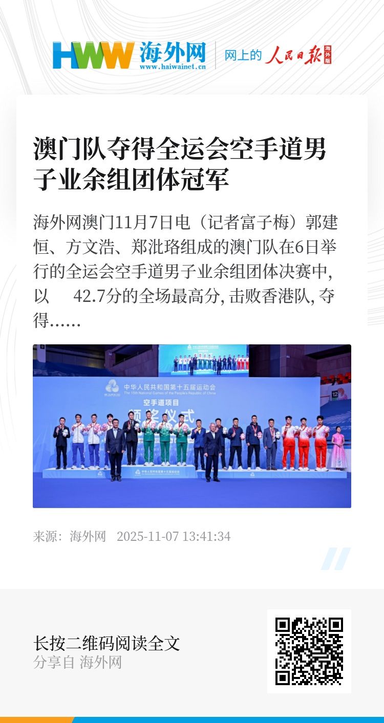 海外网澳门11月7日电(记者富子梅)郭建恒、方文浩、郑沘珞组成的澳门队在6日举行的全运会空手道男子业余组团体决赛中,以 42.7分的全场最高分,击败香港队,夺得冠军。这是澳门参加全运会以来的首枚金牌,也是本届全运会澳门赛区的第一枚金牌。澳门特区行政长官岑浩辉出席颁奖礼,为澳门运动员颁发金牌。