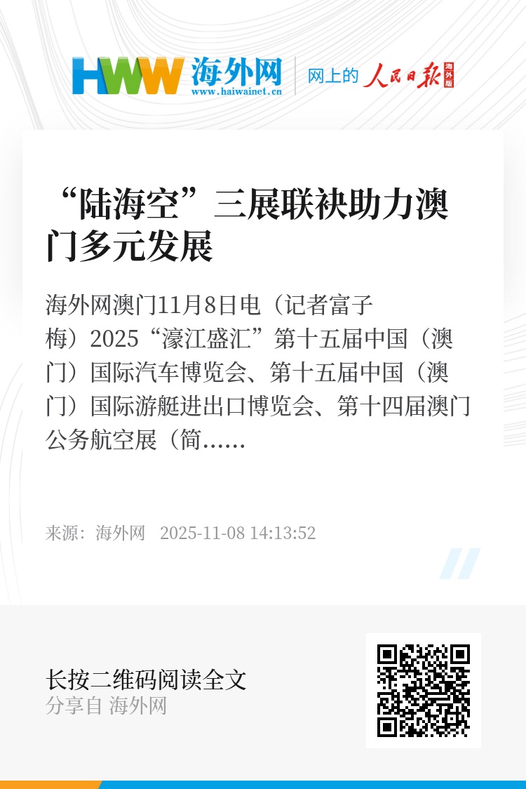 海外网澳门11月8日电(记者富子梅)2025“濠江盛汇”第十五届中国(澳门)国际汽车博览会、第十五届中国(澳门)国际游艇进出口博览会、第十四届澳门公务航空展(简称“海陆空三展”)7日在澳门开幕。