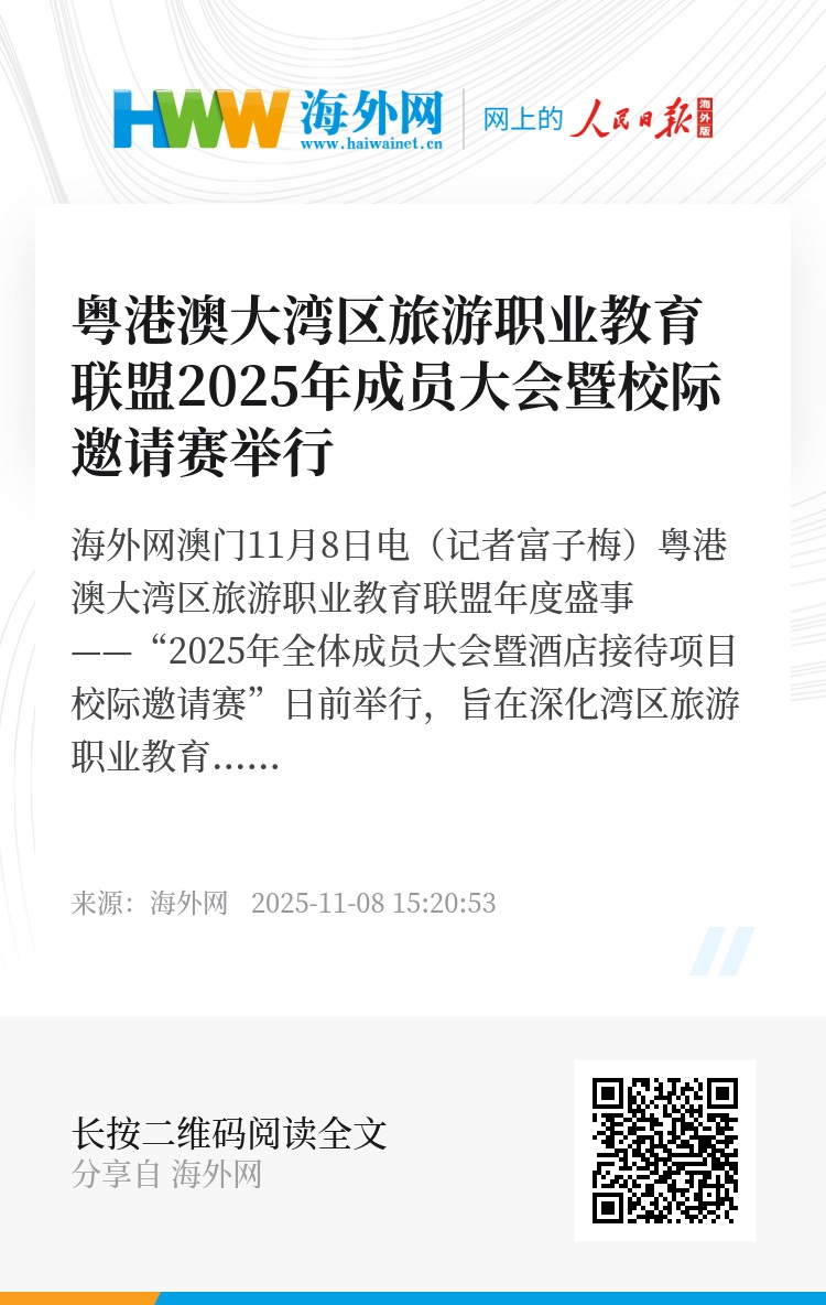 海外网澳门11月8日电(记者富子梅)粤港澳大湾区旅游职业教育联盟年度盛事——“2025年全体成员大会暨酒店接待项目校际邀请赛”日前举行,旨在深化湾区旅游职业教育合作,促进产教融合,为大湾区世界级旅游目的地建设,培育更多高素质技能人才。