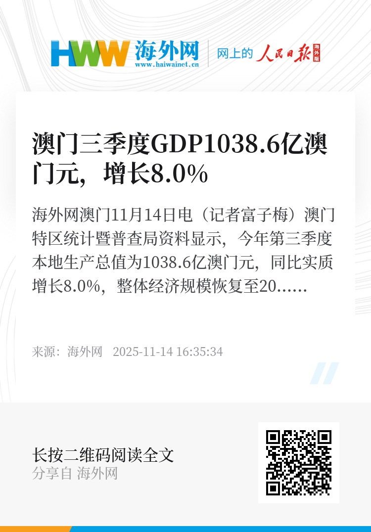海外网澳门11月14日电(记者富子梅)澳门特区统计暨普查局资料显示,今年第三季度本地生产总值为1038.6亿澳门元,同比实质增长8.0%,整体经济规模恢复至2019年同期的92.6%。