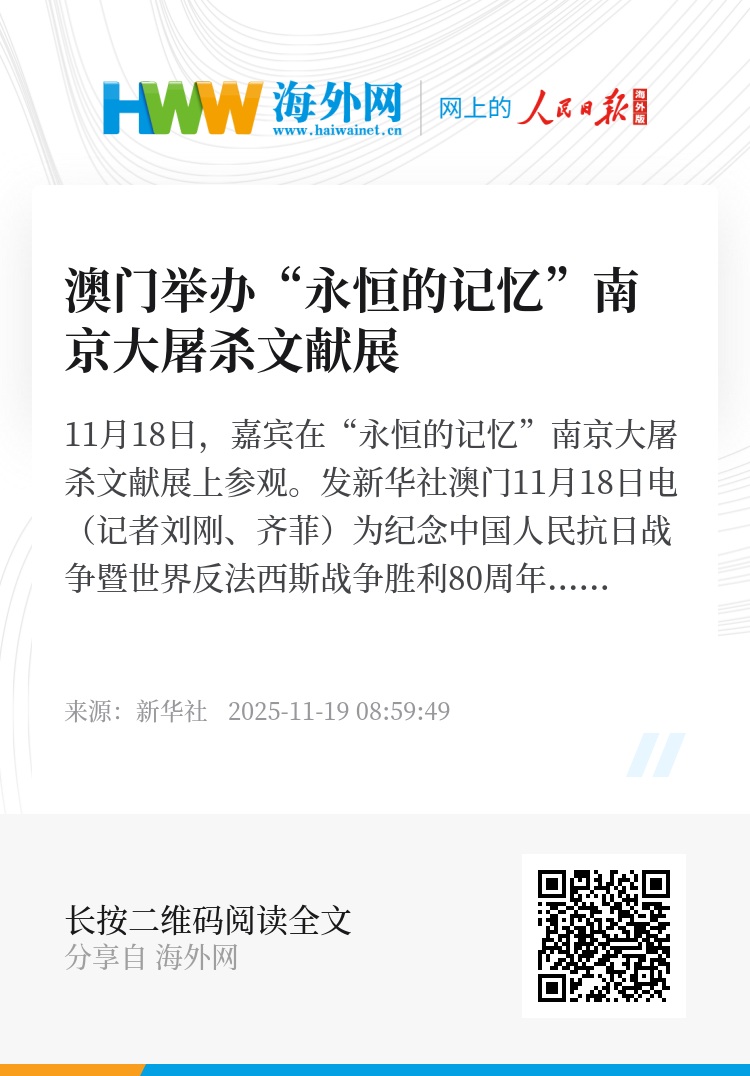 新华社澳门11月18日电(记者刘刚、齐菲)为纪念中国人民抗日战争暨世界反法西斯战争胜利80周年,“永恒的记忆”南京大屠杀文献展18日在澳门中国与葡语国家商贸合作服务平台综合体开幕,以珍贵史料筑牢历史记忆,凝聚和平力量。