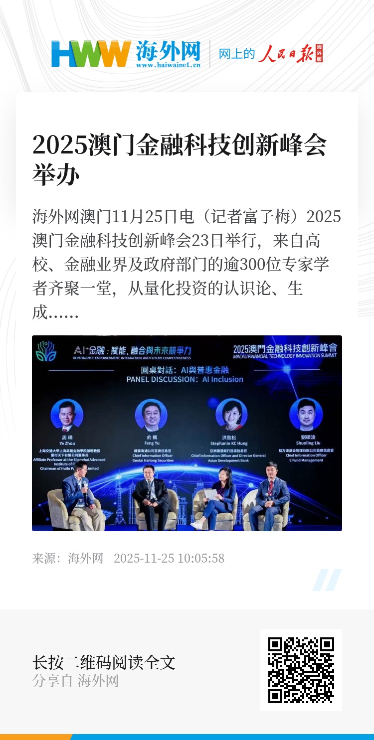 海外网澳门11月25日电(记者富子梅)2025澳门金融科技创新峰会23日举行,来自高校、金融业界及政府部门的逾300位专家学者齐聚一堂,从量化投资的认识论、生成式AI的经济学影响,到量子计算与AI科学家的前沿边界,展开跨学科深度对话,共同探讨AI真正赋能金融的科学方法。