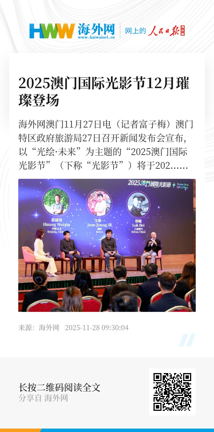 海外网澳门11月27日电(记者富子梅)澳门特区政府旅游局27日召开新闻发布会宣布,以“光绘·未来”为主题的“2025澳门国际光影节”(下称“光影节”)将于2025年12月6日至2026年1月11日举行。活动将在南湾区、北区及新口岸区打造三大光影展区,融合社区活动与美食元素,推动社区旅游与夜间经济,丰富澳门“世界旅游休闲中心”内涵。