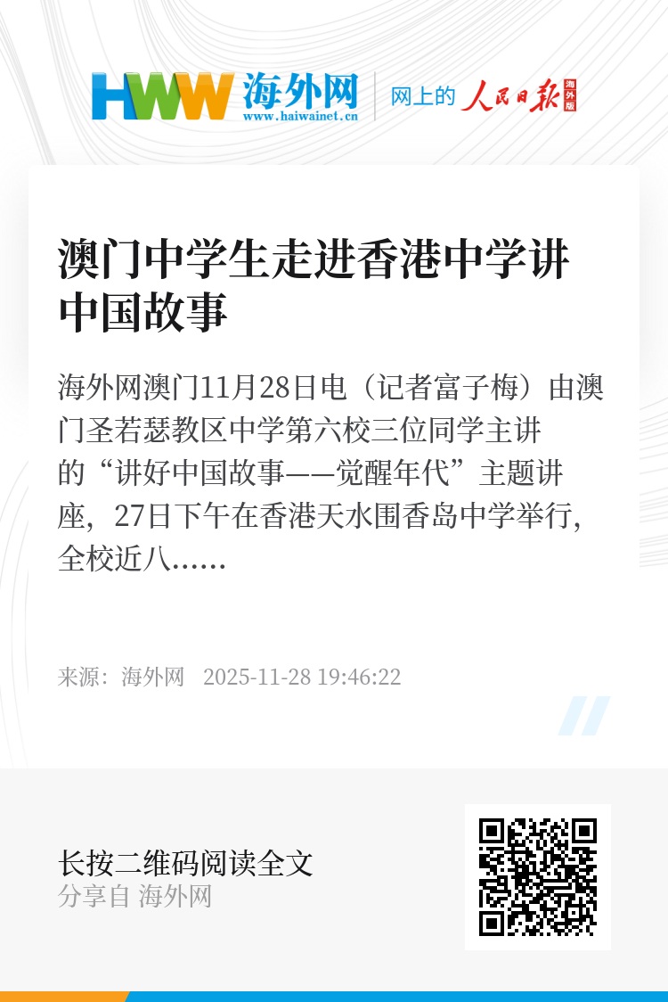 海外网澳门11月28日电(记者富子梅)由澳门圣若瑟教区中学第六校三位同学主讲的“讲好中国故事——觉醒年代”主题讲座,27日下午在香港天水围香岛中学举行,全校近八百名师生参与。“此举开创了港澳中学之间交流合作的先河。”香港天水围香岛中学校监杨耀忠指出。