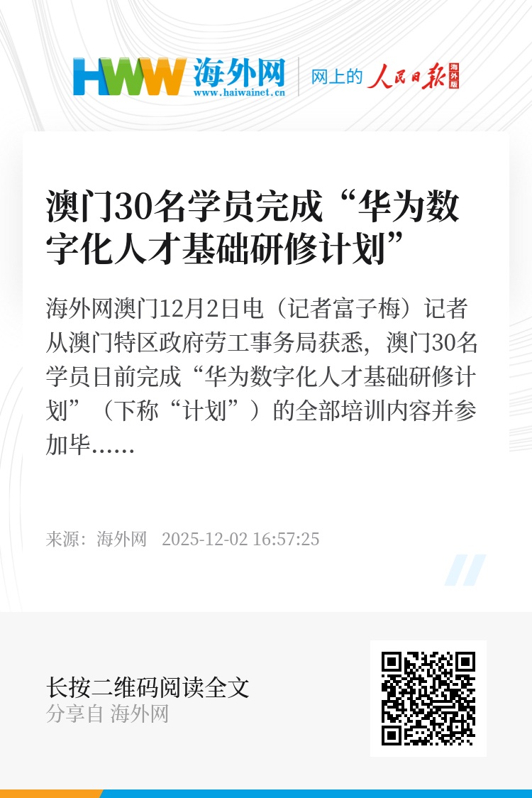 海外网澳门12月2日电(记者富子梅)记者从澳门特区政府劳工事务局获悉,澳门30名学员日前完成“华为数字化人才基础研修计划”(下称“计划”)的全部培训内容并参加毕业礼。该计划旨在培育数字化青年人才,助其成为连接传统产业与数字科技的桥梁,促进澳门“1+4”经济适度多元发展。