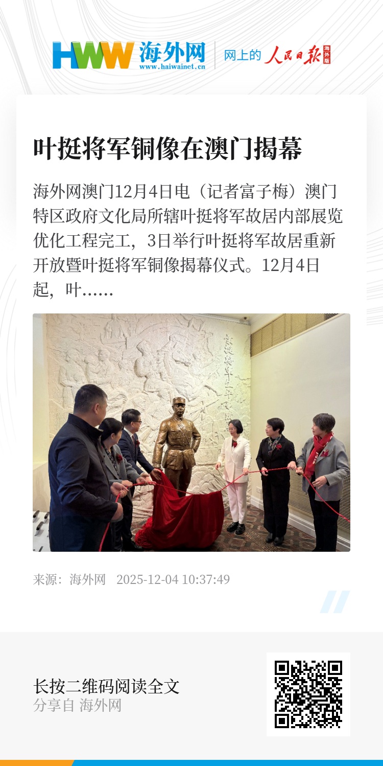 海外网澳门12月4日电(记者富子梅)澳门特区政府文化局所辖叶挺将军故居内部展览优化工程完工,3日举行叶挺将军故居重新开放暨叶挺将军铜像揭幕仪式。12月4日起,叶挺将军故居重新对公众开放。