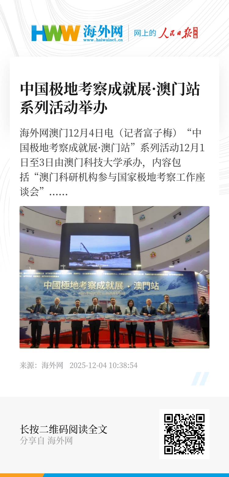 海外网澳门12月4日电(记者富子梅)“中国极地考察成就展·澳门站”系列活动12月1日至3日由澳门科技大学承办,内容包括“澳门科研机构参与国家极地考察工作座谈会”“2025年极地知识进校园澳门站”和“中国极地考察成就展澳门站开幕式”等,为深化内地与澳门在极地科研、科普领域的交流合作注入了新的活力。