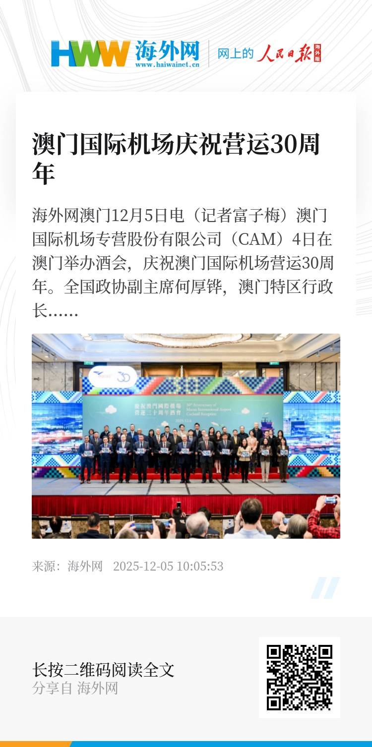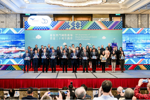 海外网澳门12月5日电(记者富子梅)澳门国际机场专营股份有限公司(CAM)4日在澳门举办酒会,庆祝澳门国际机场营运30周年。全国政协副主席何厚铧,澳门特区行政长官代表、运输工务司司长谭伟文,CAM董事会主席马有恒,中国民用航空局副局长马兵等主礼嘉宾,与近400位各界人士齐聚一堂,共同见证这一历史时刻。