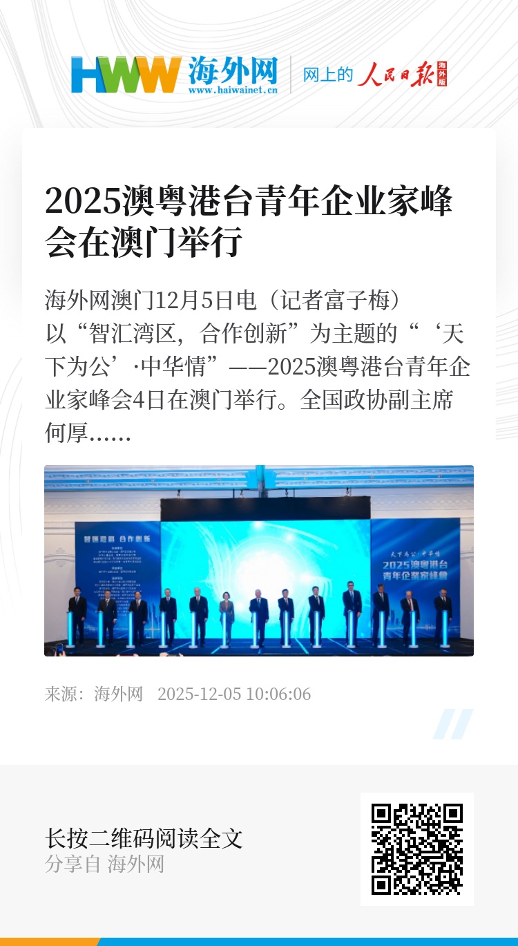 海外网澳门12月5日电(记者富子梅)以“智汇湾区,合作创新”为主题的“‘天下为公’·中华情”——2025澳粤港台青年企业家峰会4日在澳门举行。全国政协副主席何厚铧出席开幕式并致辞。