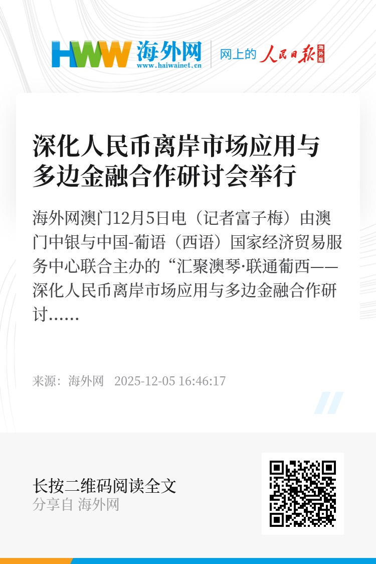 海外网澳门12月5日电(记者富子梅)由澳门中银与中国-葡语(西语)国家经济贸易服务中心联合主办的“汇聚澳琴·联通葡西——深化人民币离岸市场应用与多边金融合作研讨会”5日举行,汇聚监管、金融业与企业共识,进一步发挥澳门作为“精准联系人”的作用和中葡平台优势,为深化人民币离岸市场应用与多边金融合作注入新动能。