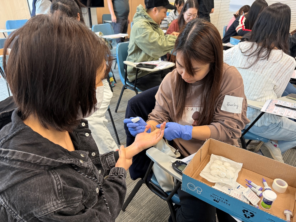 图为学员们学习测量指尖血糖以了解血糖监测的重要性。(澳门特区卫生局供图)