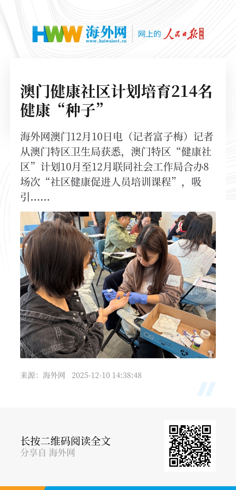 海外网澳门12月10日电(记者富子梅)记者从澳门特区卫生局获悉,澳门特区“健康社区”计划10月至12月联同社会工作局合办8场次“社区健康促进人员培训课程”,吸引78间社团及社服机构参与,214名学员完成培训并获颁证书,成为健康“种子”,有效提升专业能力,为落实“健康社区”计划注入新动力。