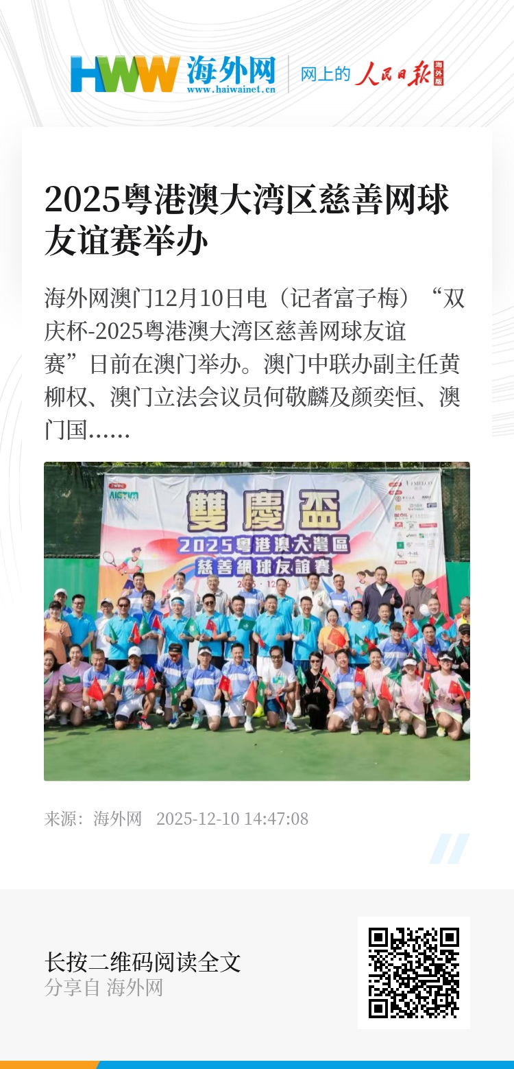 赛事主办方代表梁沛松表示,该项赛事自2019年举办以来,以网球为桥梁,广泛团结粤港澳大湾区各界人士,推动澳门群众网球运动开展,建立澳门网球文化交流平台,增进了湾区各城市间的交流合作。
