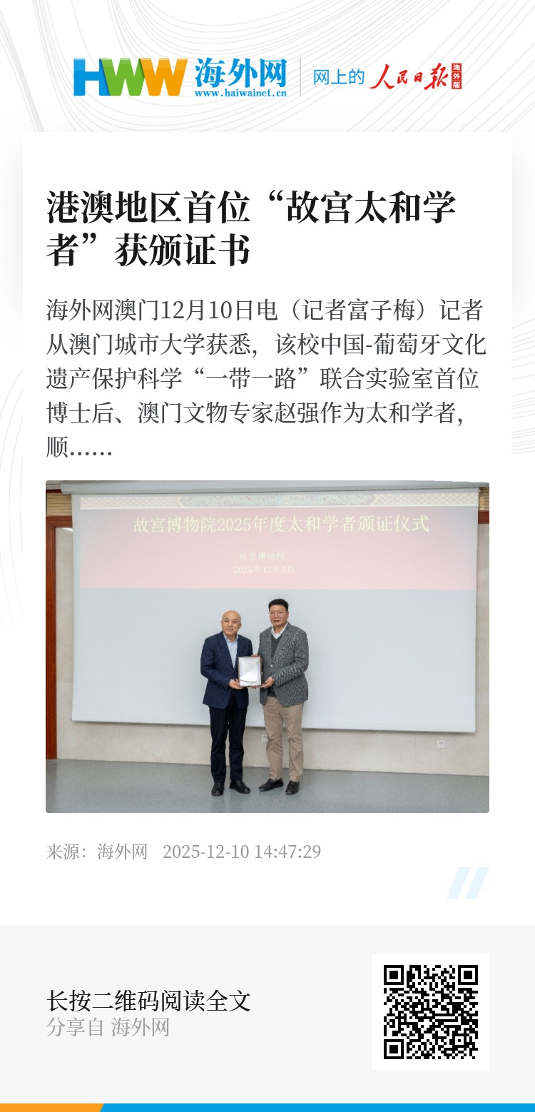海外网澳门12月10日电(记者富子梅)记者从澳门城市大学获悉,该校中国-葡萄牙文化遗产保护科学“一带一路”联合实验室首位博士后、澳门文物专家赵强作为太和学者,顺利完成在故宫博物院为期半年的学术访问和交流,日前获得故宫博物院院长王旭东颁发的证书。据悉,赵强是首位完成“太和学者计划”的港澳地区学者。