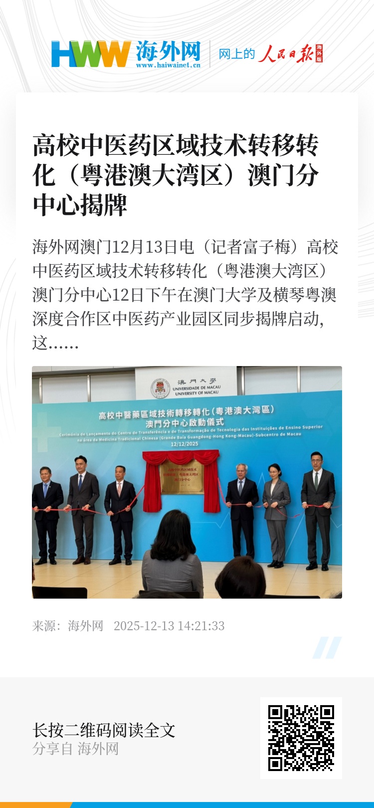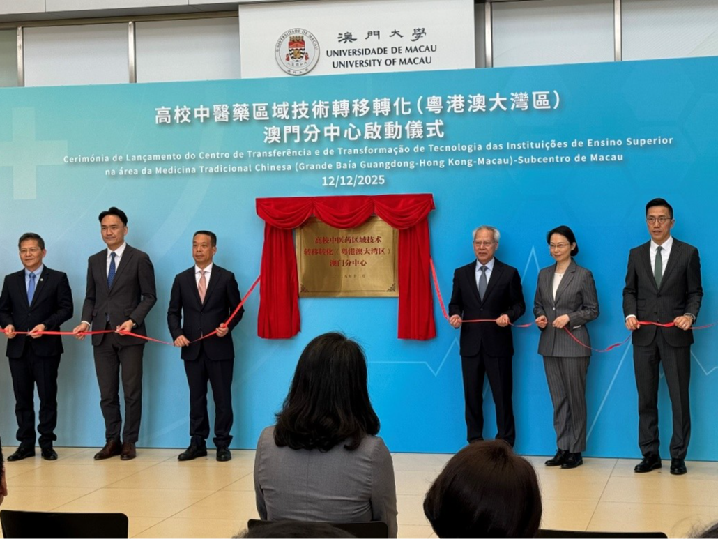 海外网澳门12月13日电(记者富子梅)高校中医药区域技术转移转化(粤港澳大湾区)澳门分中心12日下午在澳门大学及横琴粤澳深度合作区中医药产业园区同步揭牌启动,这是构建科研成果向实际应用转化的重要里程碑。