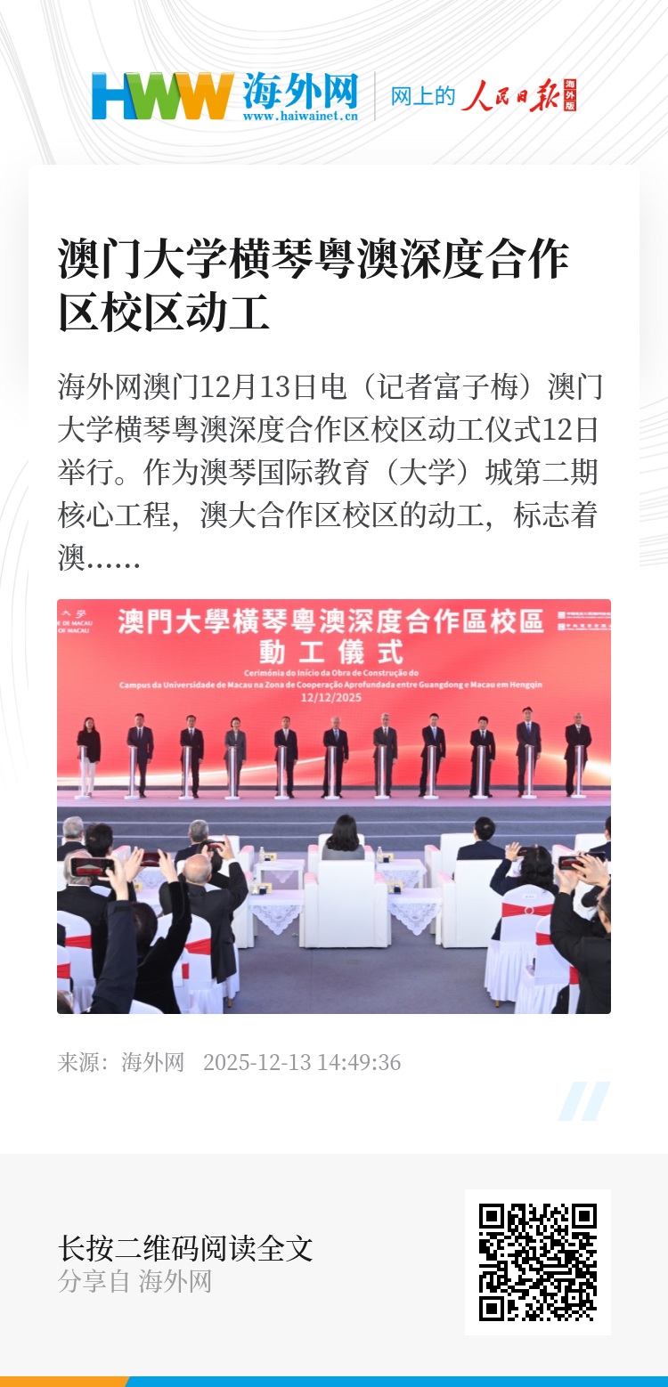 海外网澳门12月13日电(记者富子梅)澳门大学横琴粤澳深度合作区校区动工仪式12日举行。作为澳琴国际教育(大学)城第二期核心工程,澳大合作区校区的动工,标志着澳琴教育一体化从“使用现有设施”向“实体建设”的关键跨越,是澳门大学开启高质量发展新篇章、迈向澳琴全面深度融合的重要里程碑,为“一国两制”框架下澳门高等院校跨境延伸办学、服务国家高水平科技自立自强迈出的坚实一步,为澳门建设国际高端人才集聚高地注入新动力。