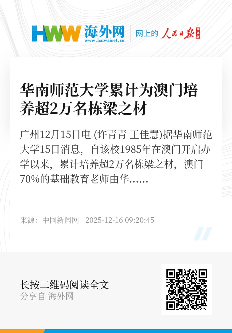 中新网广州12月15日电 (许青青 王佳慧)据华南师范大学15日消息,自该校1985年在澳门开启办学以来,累计培养超2万名栋梁之材,澳门70%的基础教育老师由华师培养,成为名副其实的“澳门教师摇篮”。