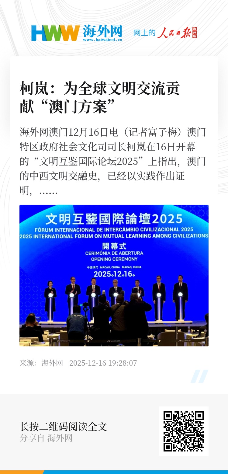 海外网澳门12月16日电(记者富子梅)澳门特区政府社会文化司司长柯岚在16日开幕的“文明互鉴国际论坛2025”上指出,澳门的中西文明交融史,已经以实践作出证明,并将继续证明,“零和博弈”的旧模式难以久长,“合作和谐”的新路径才是文明方向。澳门近五百年的历史就是中西文明和谐共生、共同发展的真实记录。