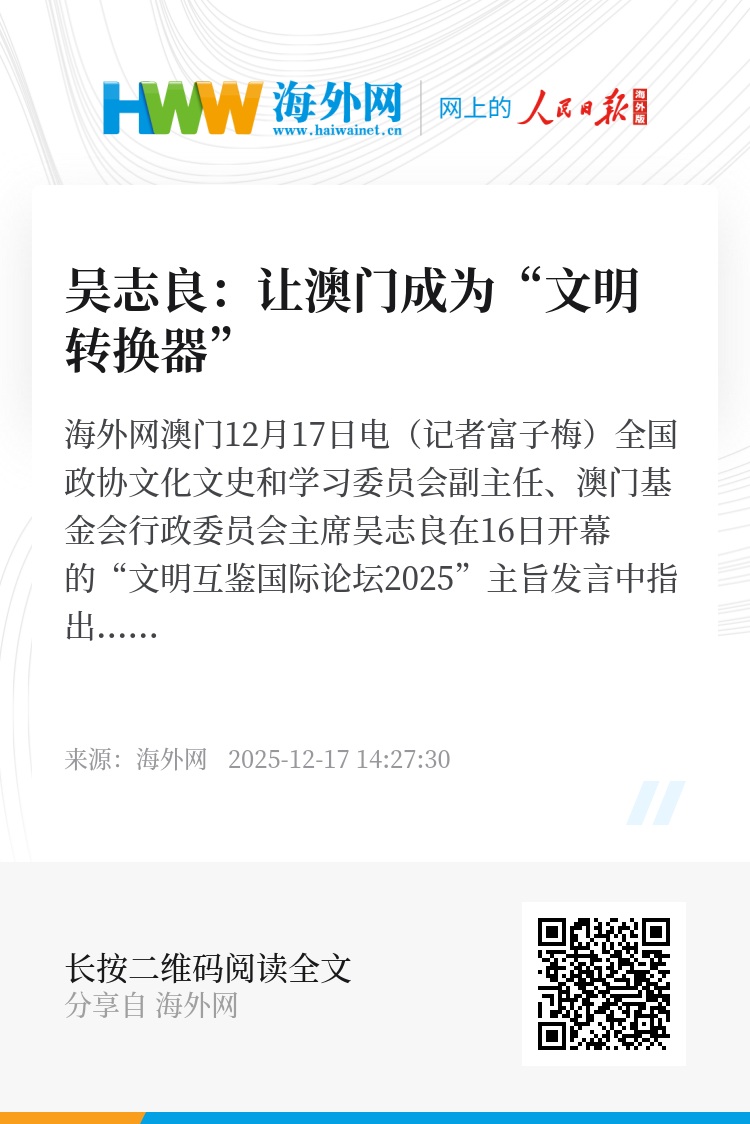 海外网澳门12月17日电(记者富子梅)全国政协文化文史和学习委员会副主任、澳门基金会行政委员会主席吴志良在16日开幕的“文明互鉴国际论坛2025”主旨发言中指出,澳门应当从“文明实验室”,主动向“文明转换器”升级,以400多年持续发展所积蓄的智慧与经验,在跨文明对话中承担使命,发挥作用。
