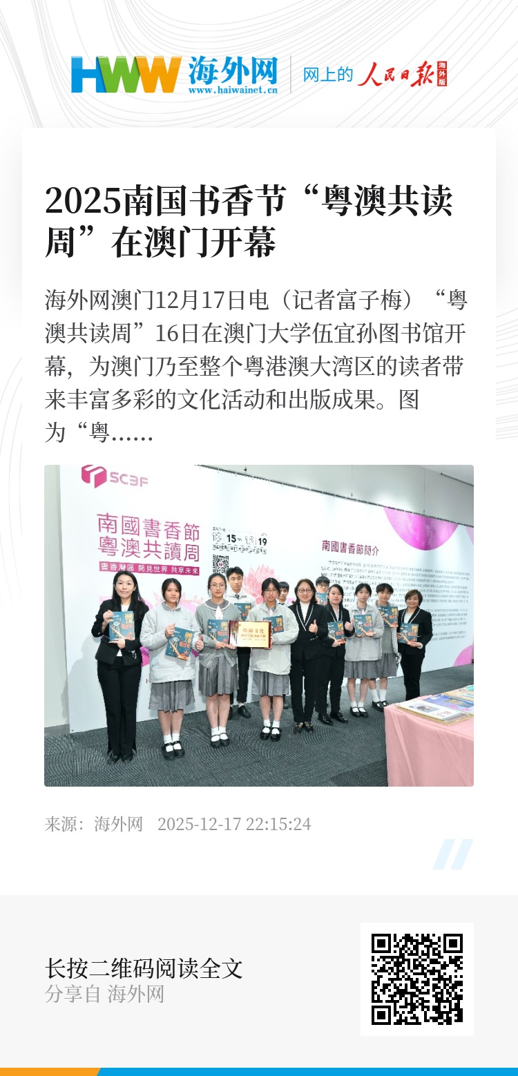 海外网澳门12月17日电(记者富子梅)“粤澳共读周”16日在澳门大学伍宜孙图书馆开幕,为澳门乃至整个粤港澳大湾区的读者带来丰富多彩的文化活动和出版成果。