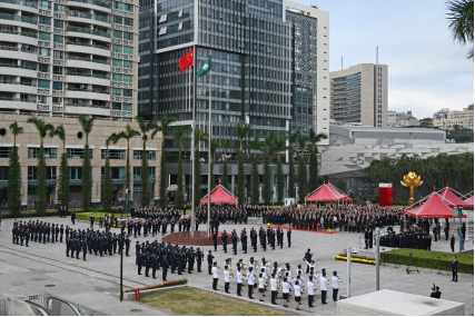 图为庆祝澳门特别行政区成立26周年升旗仪式在金莲花广场举行。(澳门特区政府新闻局供图)