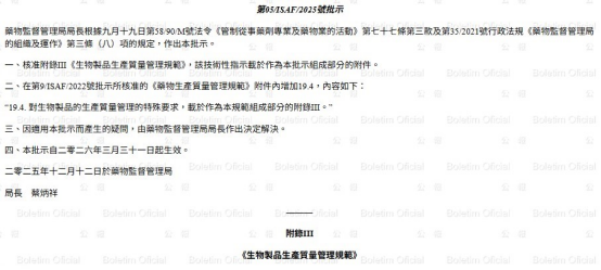 图为《生物制品生产质量管理规范》技术性指示。(澳门药监局供图)