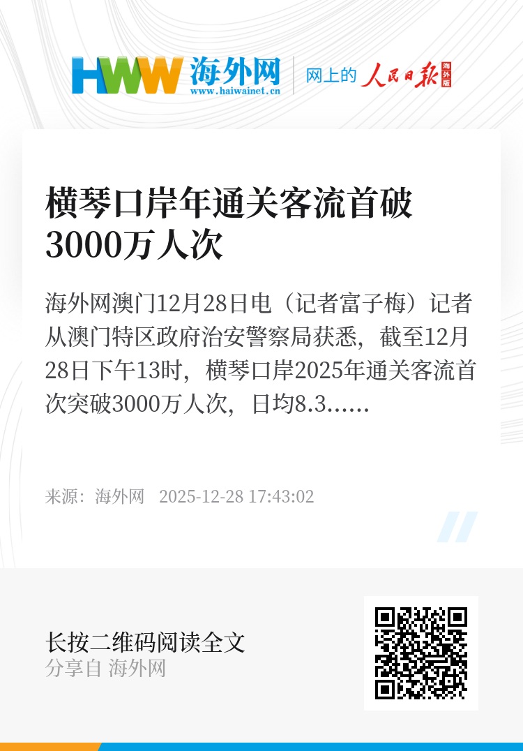 海外网澳门12月28日电(记者富子梅)记者从澳门特区政府治安警察局获悉,截至12月28日下午13时,横琴口岸2025年通关客流首次突破3000万人次,日均8.3万人次,同比增长32.9%。这是横琴口岸启用以来,首次在自然年度内达到3000万人次的客流规模,创历史新高。
