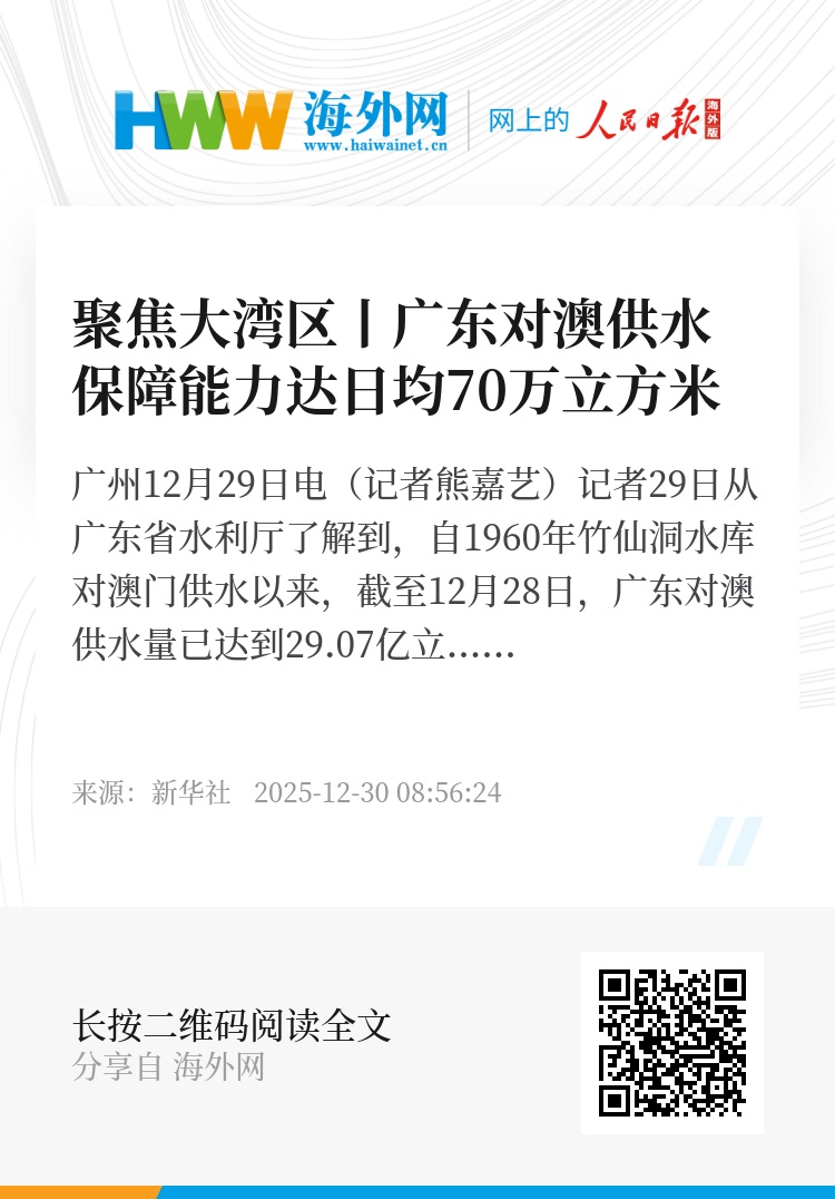 新华社广州12月29日电(记者熊嘉艺)记者29日从广东省水利厅了解到,自1960年竹仙洞水库对澳门供水以来,截至12月28日,广东对澳供水量已达到29.07亿立方米,目前对澳供水保障能力达日均70万立方米,源源清水为澳门长远发展筑牢坚实用水保障。